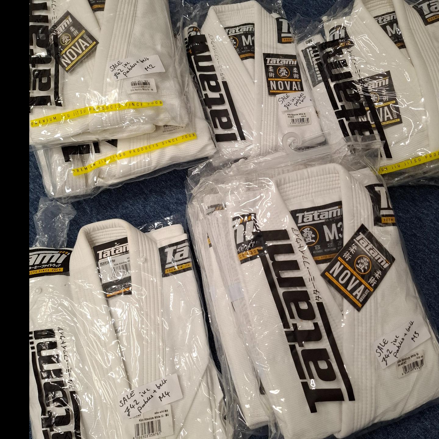 Basic Tatami white Gi, with a set of patches with club logo to apply, no belt. Sale, discontinued