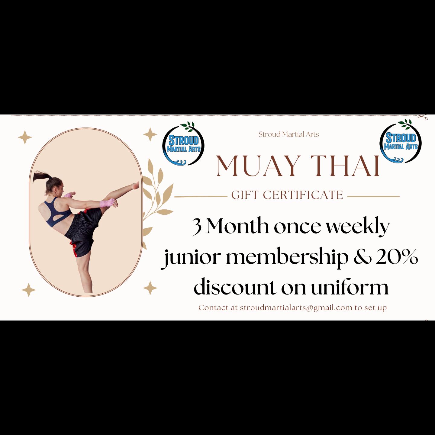 Gift Voucher for 3 month once a week junior membership and a single use 20% discount on uniform/equipment from the club shop (sale to be placed with staff member in person to apply discount). Paper Voucher to be placed inside cards, with either muay thai or jiu-jitsu styling.